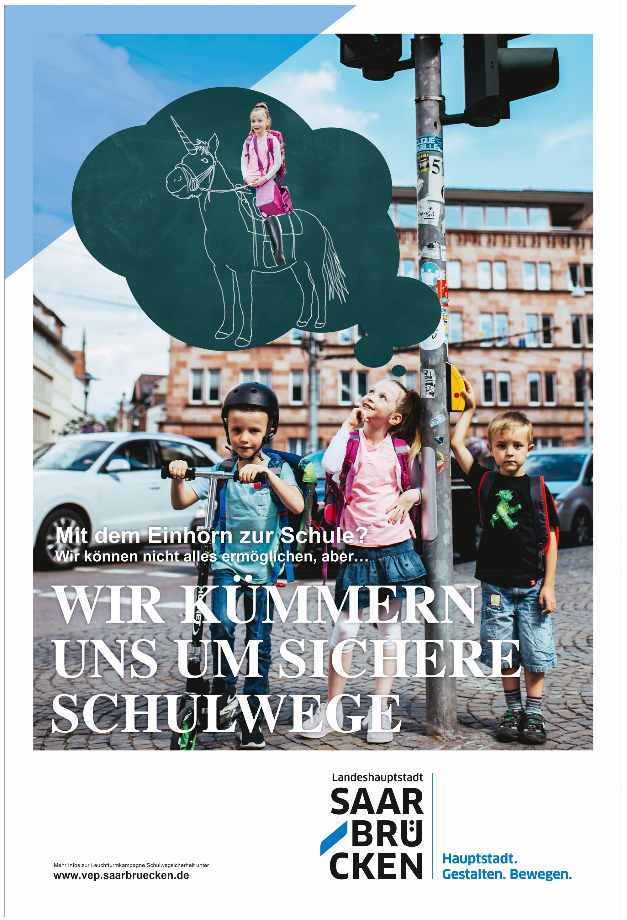 Um sicherzustellen, dass möglichst alle Interessierten an Informationen gelangen, wurden verschiedene Kanäle gewählt. Um die breite Öffentlichkeit auf das Projekt generell und sichere Schulwege aufmerksam zu machen, startete die Landeshauptstadt im Jahr 2017 eine ausgefallene Plakataktion. Die Plakate sollten auf humorvolle Art und Weise die Bedeutung der Schulwegplanung und Schulwegsicherheit bekräftigen und ins Blickfeld der Öffentlichkeit rücken. Daher lief die Aktion stadtweit, um möglichst viele Menschen darauf aufmerksam zu machen Die Plakate können Sie hier ansehen.